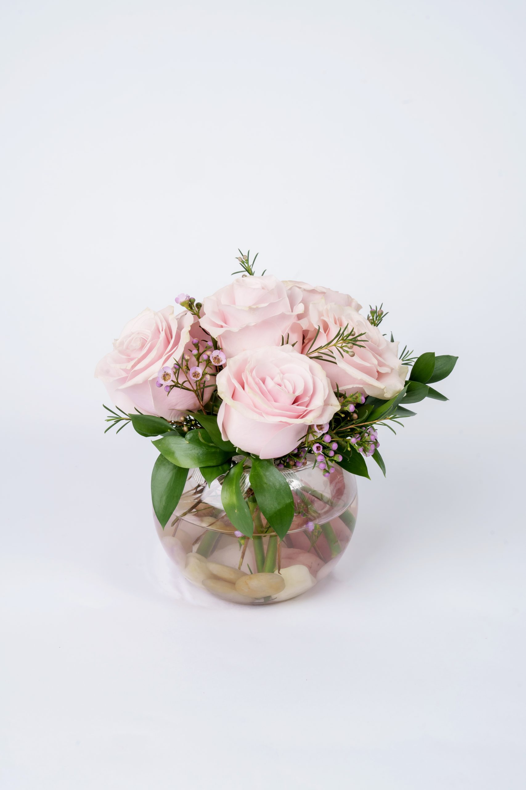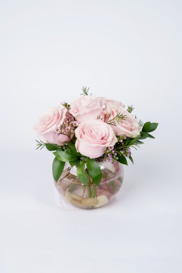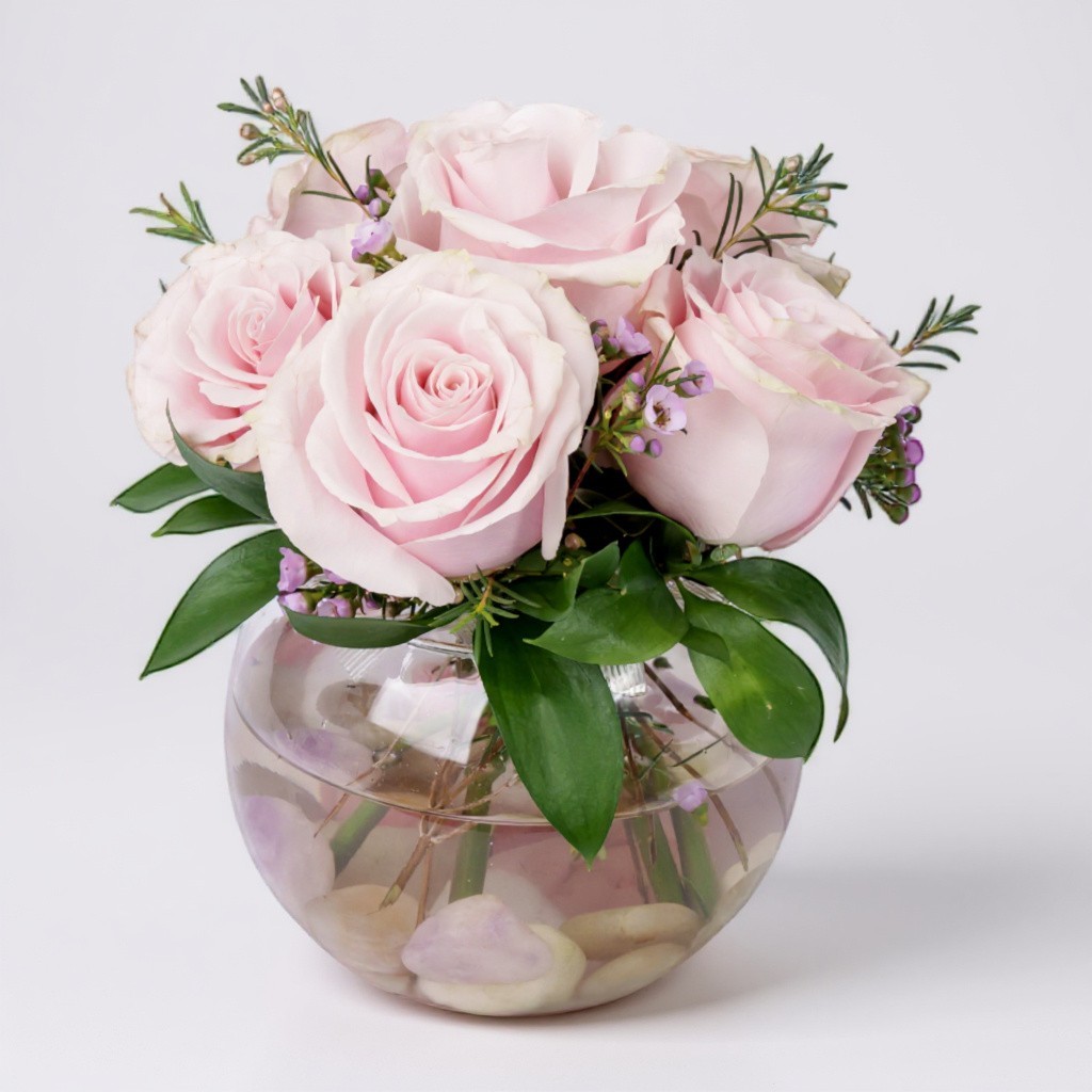 Soft, romantic, and perfectly petite—Blush Serenity features pale pink roses delicately arranged with waxflower, fresh greenery, and nestled in a clear fishbowl vase with smooth river stones. A gentle and graceful design perfect for expressing love, sympathy, or sweet congratulations.