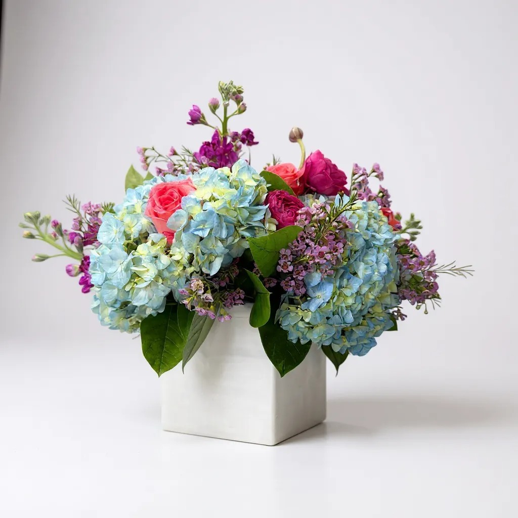Our Garden Serenade arrangement captures the beauty of a blooming garden in one elegant design. Featuring soft blue hydrangeas, bright pink roses, fuchsia ranunculus, and fragrant lavender stock, this arrangement is complemented by greenery and finished in a sleek white cube vase. A perfect choice for birthdays, anniversaries, or simply adding a cheerful pop of color to any space.