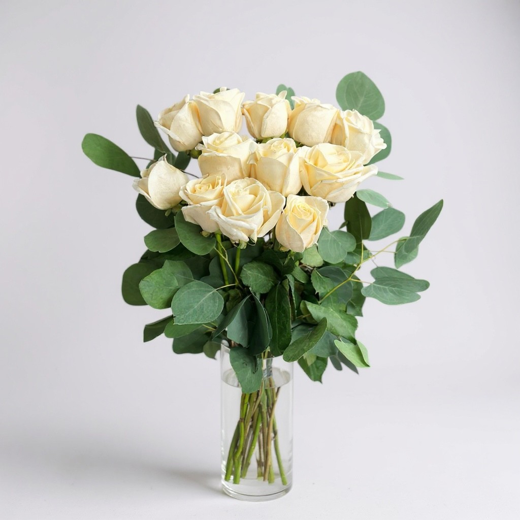 Our 1 Dozen White Roses Bouquet is artfully arranged in a classic clear glass vase, bringing a sense of calm and sophistication to any space. Each stem is hand-selected by our florists in Astoria for freshness and symmetry, then paired with fragrant eucalyptus and seasonal greenery for a clean, balanced presentation.