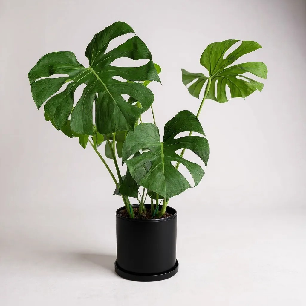 The Monstera Deliciosa features large, split leaves that make a bold statement indoors. A trendy, easy-care plant that thrives in bright spaces.