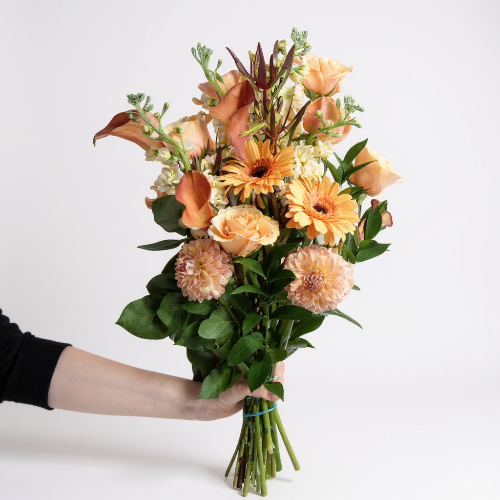 Golden Meadow is a warm, radiant bouquet built around peach roses, orange calla lilies, pale dahlias, cheerful gerberas, and creamy stock. The combination of flowers creates a golden hour palette that feels celebratory and energetic without being loud. Each flower contributes something distinct: peach roses add softness and romance, calla lilies bring clean sculptural lines, dahlias introduce layered texture, gerberas add a burst of color, and creamy stock ties the composition together with fullness and a subtle fragrance.