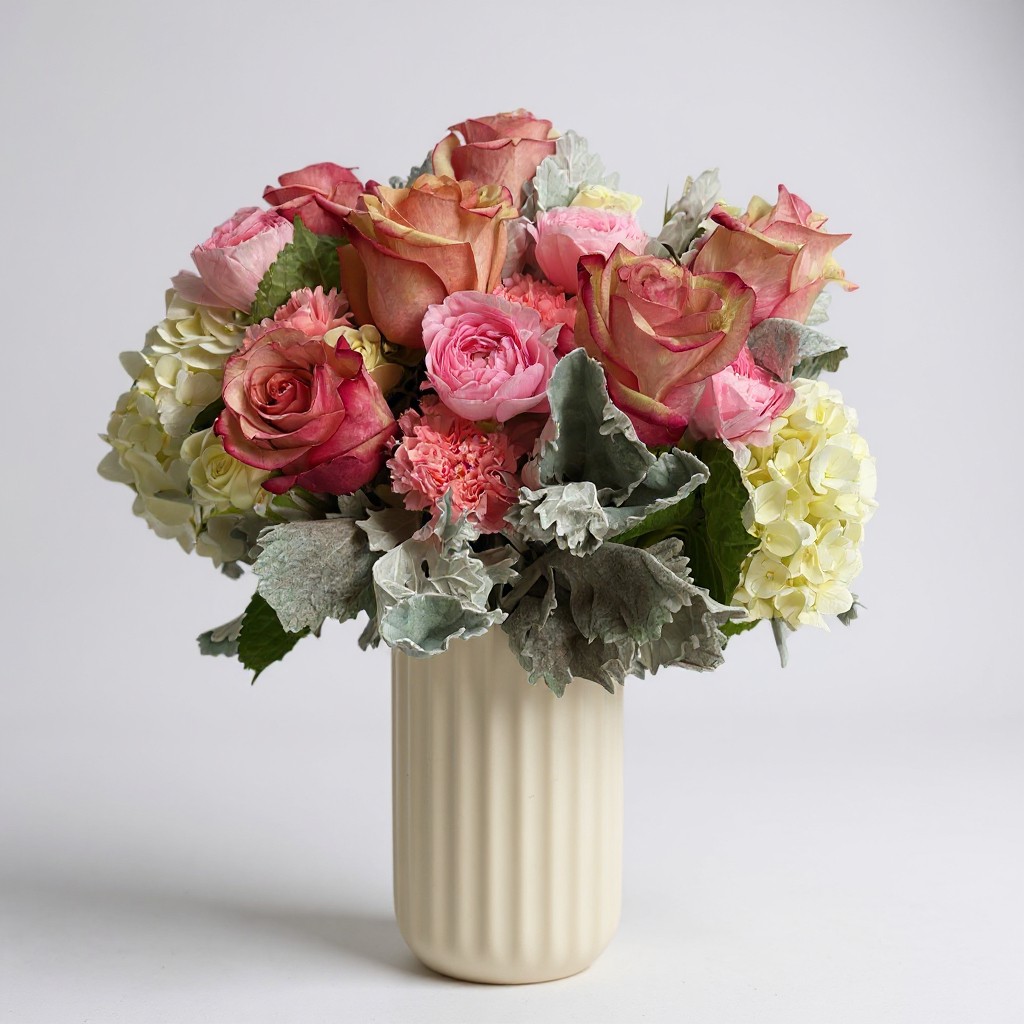 Blushing Grace combines premium roses, lush hydrangeas, soft pink ranunculus, and delicate carnations accented with velvety dusty miller in a chic ivory ribbed vase. The soft peach, blush, and cream tones create an elegant, harmonious palette that feels both classic and contemporary. The ranunculus add a layered, petal-rich texture that complements the fuller shape of the hydrangeas, while the dusty miller introduces a cool, muted contrast that enhances the pastel hues and gives the arrangement a refined, garden-inspired quality.