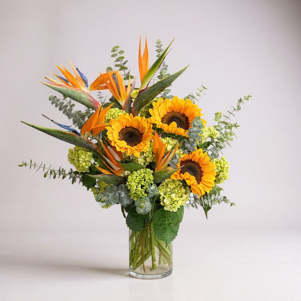 Golden Tropics brings together golden sunflowers, striking Birds of Paradise, and lush green hydrangeas, grounded by silver eucalyptus. The combination of sun-kissed warmth and tropical structure creates an arrangement with genuine range and visual impact. The sunflowers bring bold, familiar warmth, the Birds of Paradise add dramatic height and exotic flair, the green hydrangeas provide a full, grounded base, and the silver eucalyptus ties the composition together with a cool, textural contrast that prevents the warm tones from feeling too heavy.