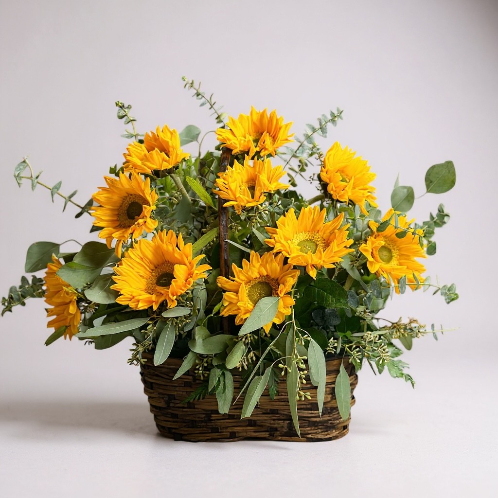 The Sunlit Meadow Basket is designed to bring instant warmth and positivity into any space. This lush arrangement features vibrant golden sunflowers arranged organically in a woven basket, paired with flowing eucalyptus and seasonal greenery for movement, texture, and freshness. The combination creates a natural, meadow-inspired look—effortless, abundant, and full of life.