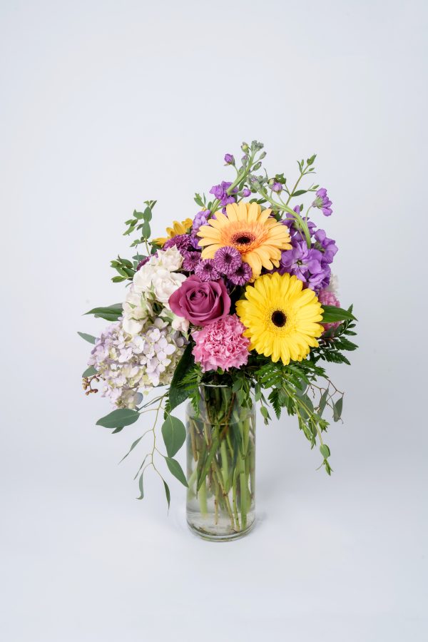 Celebrate love, light, and color with Sunrise Romance, a radiant yellow and purple mixed flower arrangement designed to uplift any moment. This striking bouquet combines golden gerbera daisies, lavender roses, hydrangea, and lush greenery, artfully balanced with accents of purple stock and soft foliage for texture and movement.