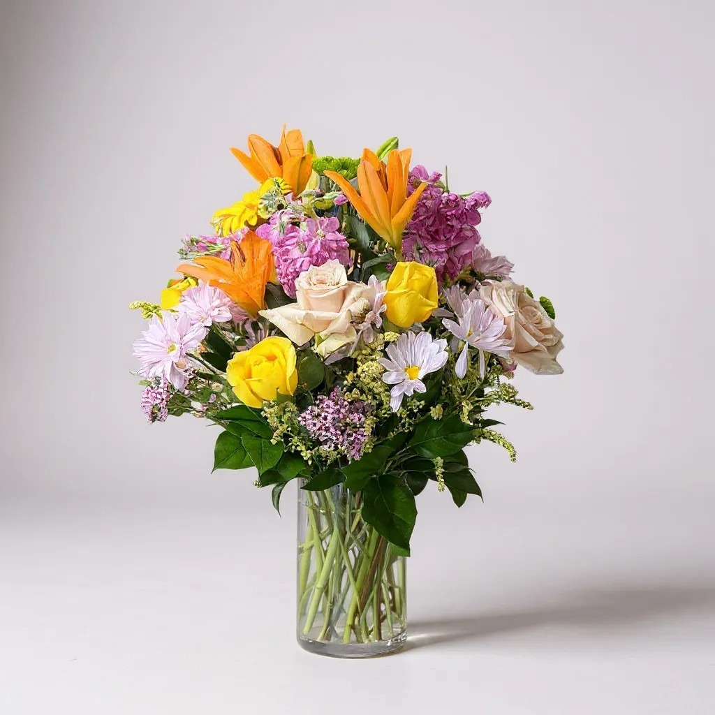 Bright Day is designed around color and energy. Sunny yellow roses, bold orange lilies, pastel-hued daisies, soft blush roses, and fragrant pink stock come together in a lively mix that feels celebratory without being excessive. Fresh greenery and filler accents add structure and fullness, while the clear glass vase keeps the natural vibrancy of the blooms front and center.